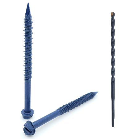 Concrete screws are a special threaded screw, with hardened notched threads and high-low threads. The notches and the high-low threads help to eliminate concrete shavings from the hole as the screw taps threads into the base material. The hole size for concrete screws is smaller than the diameter of the screw. A 3/16” screw requires a 5/32” hole and a 1/4” screw requires a 3/16” hole. The concrete screw is inserted into the hole and turned either by hand or by a rotation drill until the concrete screw is tight against the fixture being fastened.