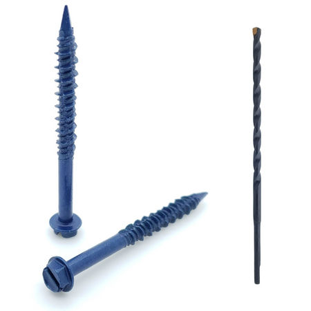 Concrete screws are a special threaded screw, with hardened notched threads and high-low threads. The notches and the high-low threads help to eliminate concrete shavings from the hole as the screw taps threads into the base material. The hole size for concrete screws is smaller than the diameter of the screw. A 3/16” screw requires a 5/32” hole and a 1/4” screw requires a 3/16” hole. The concrete screw is inserted into the hole and turned either by hand or by a rotation drill until the concrete screw is tight against the fixture being fastened.
