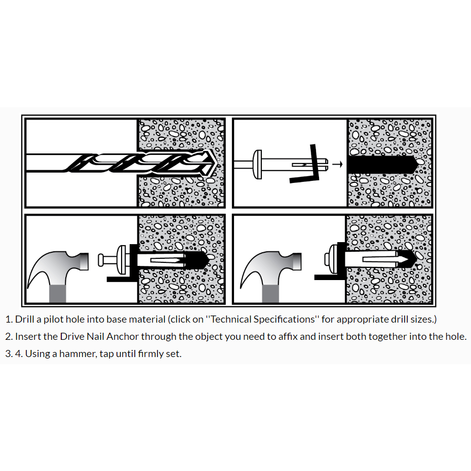 The Drive Nail Anchor is easy to install and ideal for medium-duty and tamper-proof applications in any type of masonry. It is a two-piece nail-in anchor comprised of a corrosion resistant die-cast zinc alloy anchor body. Available sizes range from 3/16” x 7/8” to 1/4" x 3”.
