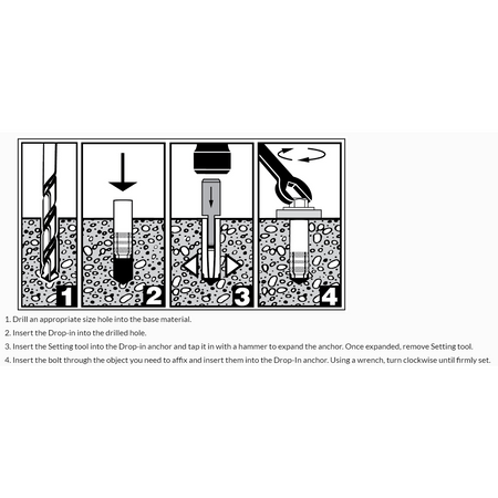 Drop in anchors are used for anchoring into solid concrete. As the the bolt is tightened, the sleeve dilates against the substrate. Drop-in anchors are made of zinc plated steel for long lasting durability and dependability. Anchors are designed to secure material or structures to concrete. Fasteners accommodate handrails, lighting fixtures, piping, and more.