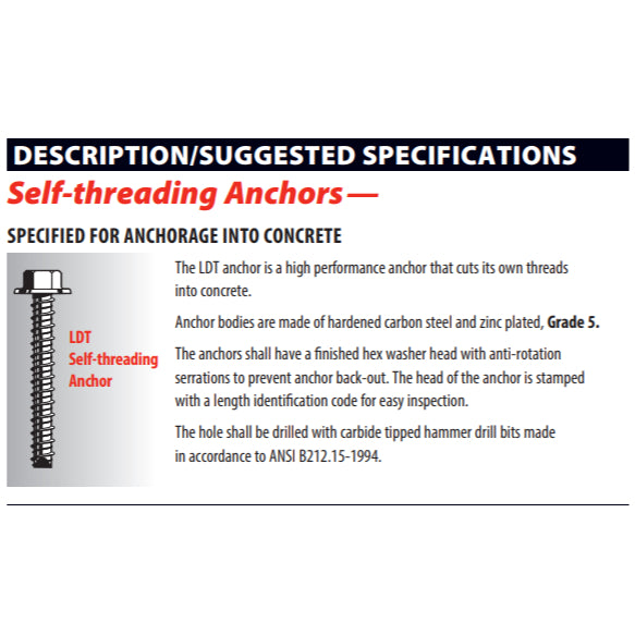 The SLDT anchor is a high performance anchor that cuts its own threads into concrete. Available in 3/8” and 1/2".