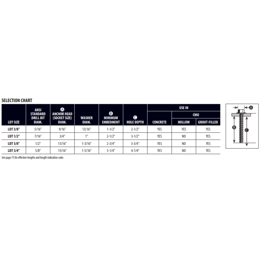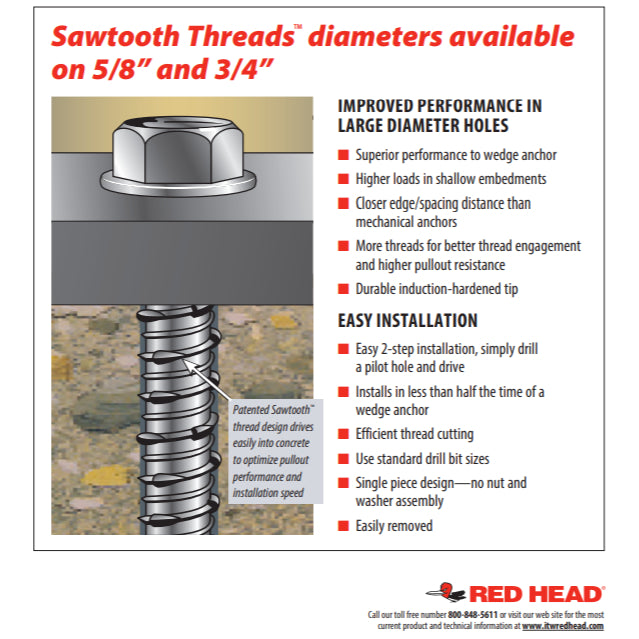 Anchor bodies are made of 410 stainless steel, Grade 5. The anchors shall have a finished hex washer head with anti-rotation serrations to prevent anchor back-out. The head of the anchor is stamped with a length identification code for easy inspection. The anchor shall be installed with carbide tipped hammer drill bits made in accordance to ANSI B212.15-1994.