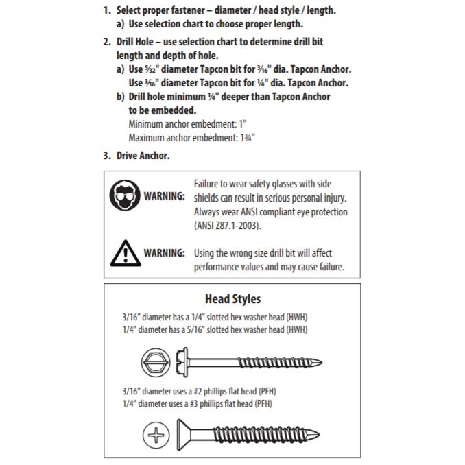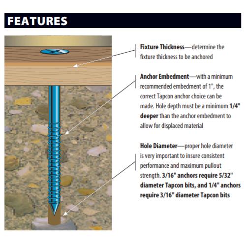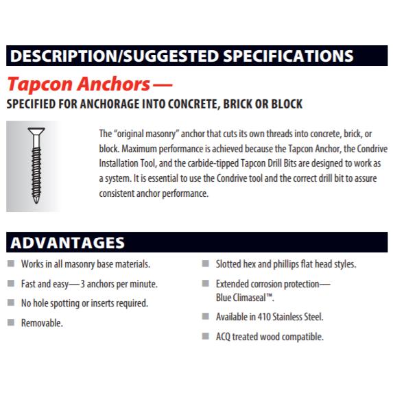 As the original Concrete screw anchor that revolutionized the construction world, Tapcon brand Concrete anchors deliver the ease of use, superior precision and the unparalleled performance that professionals demand. Tapcon Concrete screw anchors draw from its unique ability to TAP its own threads into Concrete, making it an excellent alternative to expansion anchors, plugs and lag shields. Use Tapcon Concrete screw anchors for installing sill plates, electrical equipment, furring strips and many other applications that require fastening into brick, block or Concrete.