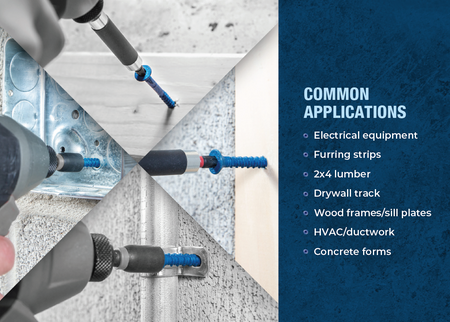 - Many applications that include shelving brackets used in electrical equipment, HVAC strapping, 2x4 lumber, wood headers, window frames, jambs & sills, door frames to masonry, plywood backer boards to masonry & exterior installation into masonry.